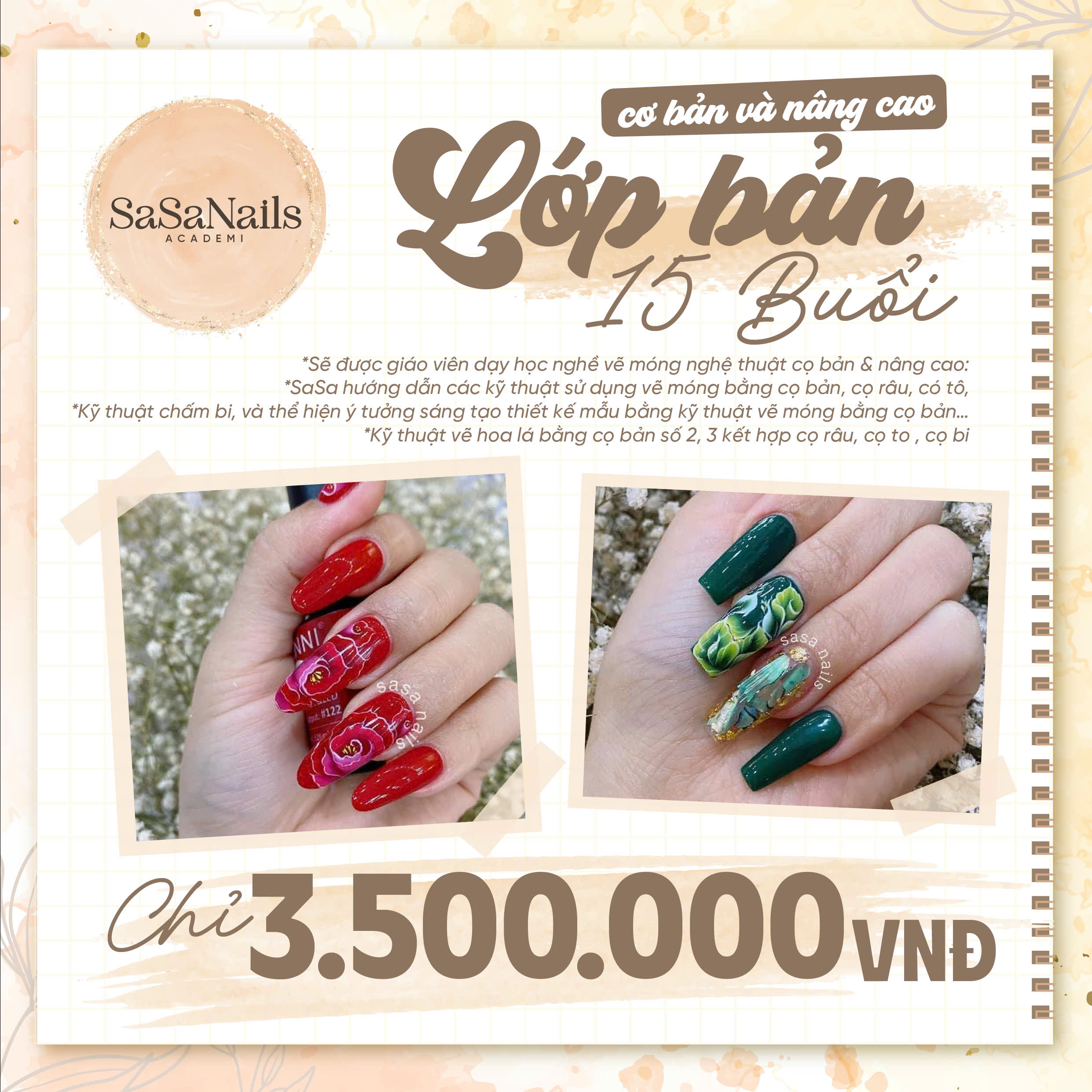 Mục tiêu: Giúp nắm vững kỹ thuật vẽ móng cơ bản đến nâng cao bằng cọ bản và các loại cọ phụ, làm chủ cách tạo hình hoa lá – họa tiết, từ đó tự tin sáng tạo và hoàn thiện các mẫu móng nghệ thuật ứng dụng trong salon.